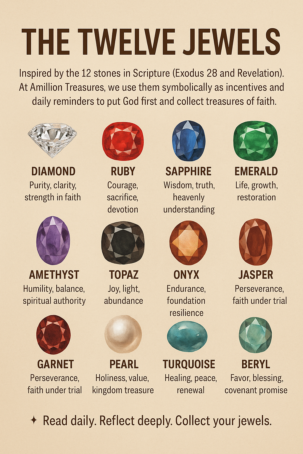 Collecting jewels reflects your streaks and consistency, showing your daily commitment to God’s Word and devotion. In Scripture, twelve precious jewels are described on the high priest’s breastplate (Exodus 28) and in the foundations of the New Jerusalem (Revelation 21). Each jewel carries a spiritual meaning that reflects God’s character and His promises for His people. At Amillion Treasures, we use these jewels as daily markers of encouragement. Each devotional is tied to one jewel; a reminder of God’s truth for that day. When you read, reflect, and declare, you are “collecting” jewels, building a treasure of faith and wisdom that cannot fade.